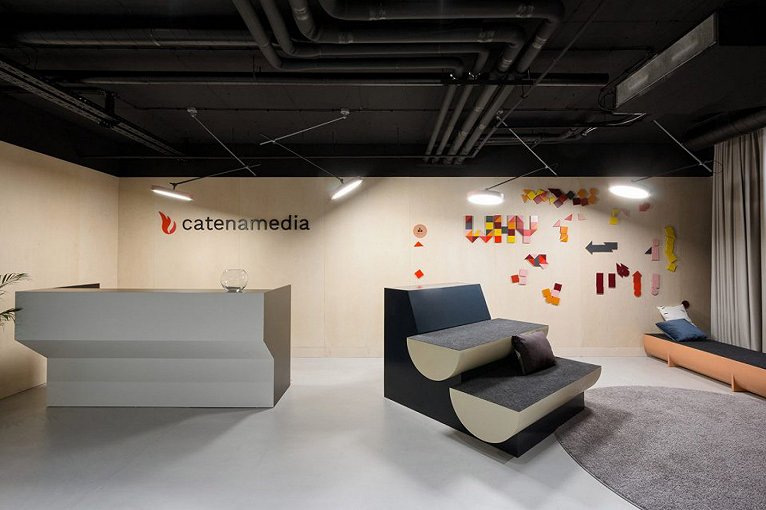 本设计是传媒公司办公空间装修设计效果,上海古都办公室装修公司设计师用中性色和天然材料主导了室内空间,天花板被漆成黑色,以中和室内丰富的细节及装置。入口处的木墙同时也是一块大型磁力板,访客和员工可以用不同形状和颜色的磁铁制作图形和信息。漂亮的山毛榉墙壁为这个工作空间带来温暖的感觉。这样,他们就可以很方便的更新欢迎讯息。